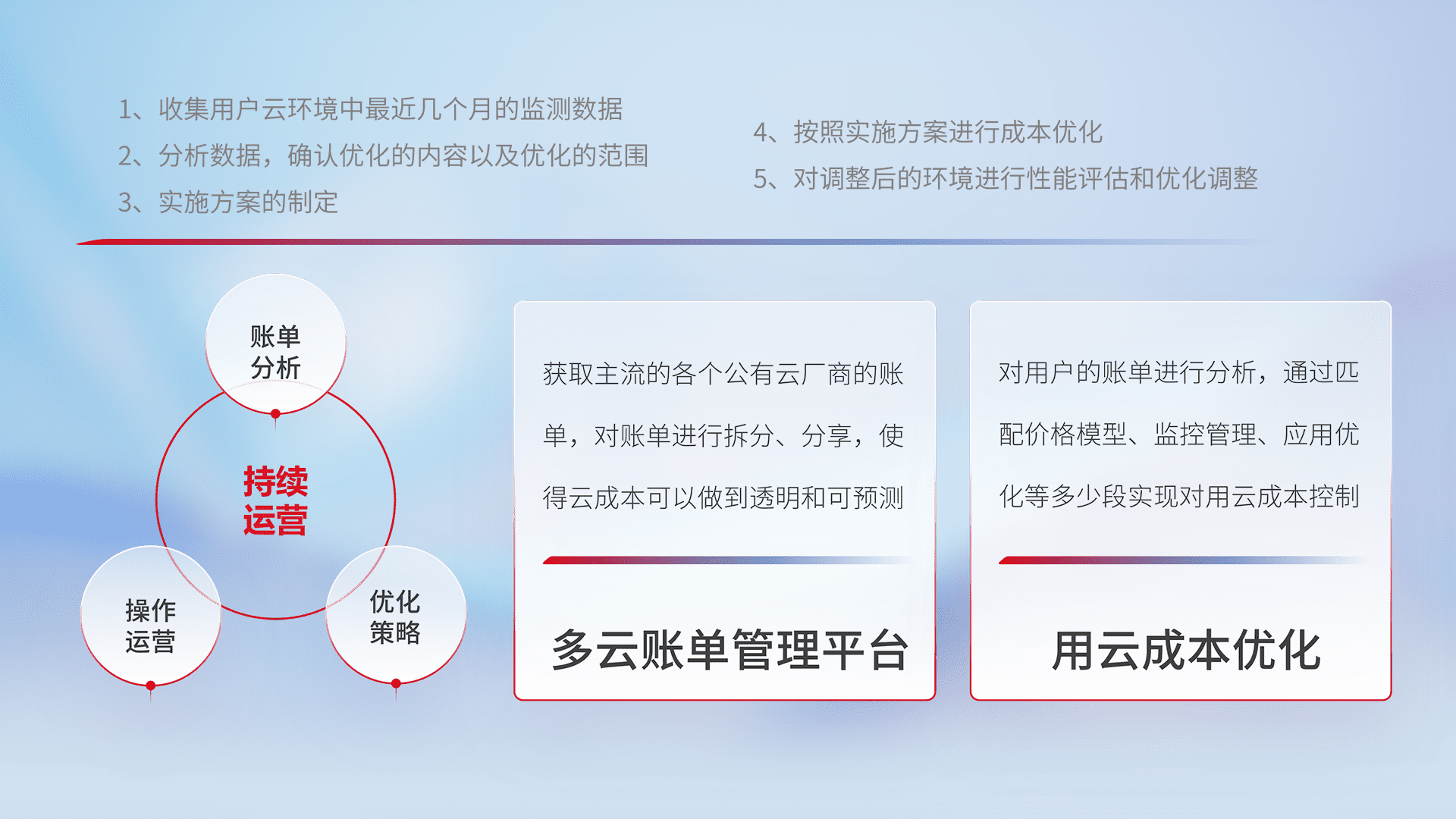 通过多云纳管,,,,以统一的资源数据模型把客户的云资源进行抽象和封装,,,,进而实现对多云资源的统一操作,,保障云资源管理的可靠性、、、稳定性与可用性。。量身定制化运维内容,,配置、、开发运维、、、、补丁管理、、、备份、、监控、、、、认证和访问管理、、、审计和日常巡检等,,保障在用云过程中的可靠度,,,稳定度以及高可用率。。。